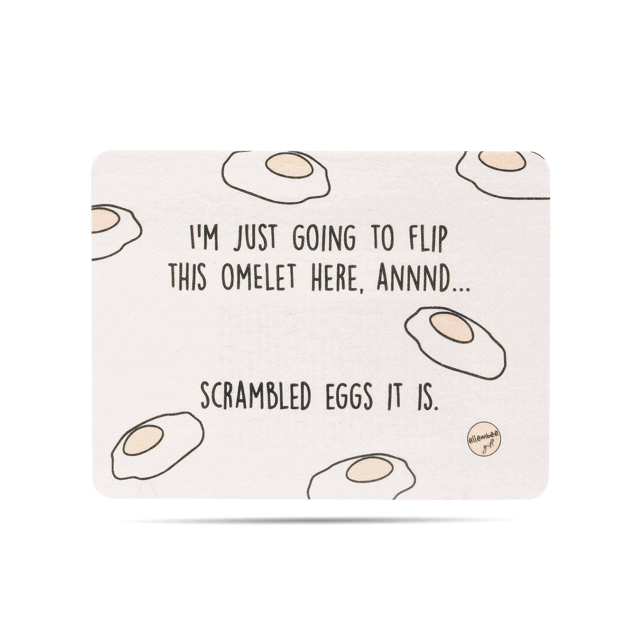 KEYWORDS: I'm just gonna flip this omelet here and scrambled eggs it is, funny printed sassy swedish dishcloth, dish rag, eco-friendly, instead of paper towel, cleaning dishes, dish sponge, unique kitchen products, specialty home goods products, wet it sponges, funny kitchen products with words, eco friendly packaging