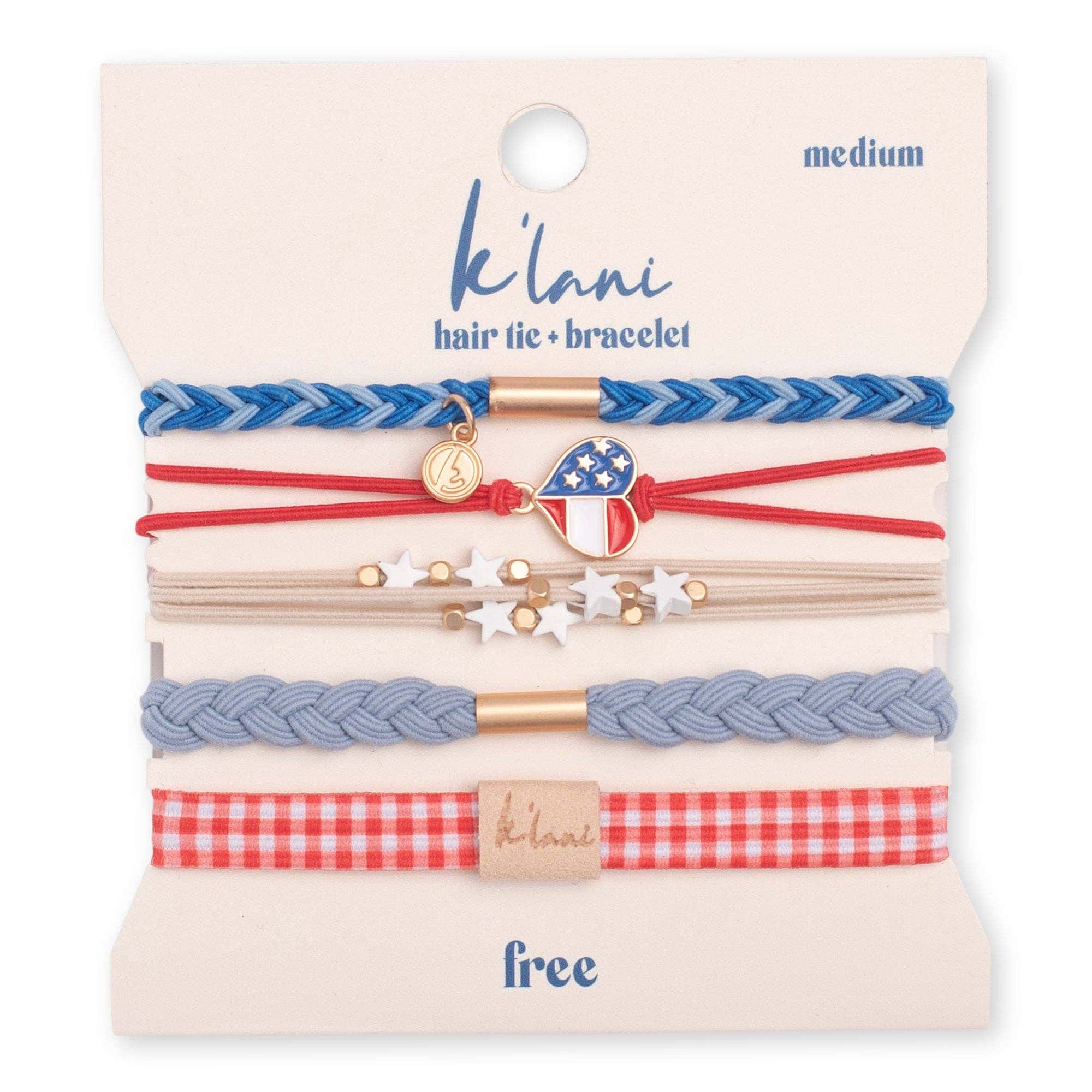 Our Free set features red, white and blue durable hair ties that double as bracelets. Adorned with gingham print, little white starts and heart charm are perfect for expressing your love for the USA with style and pride.